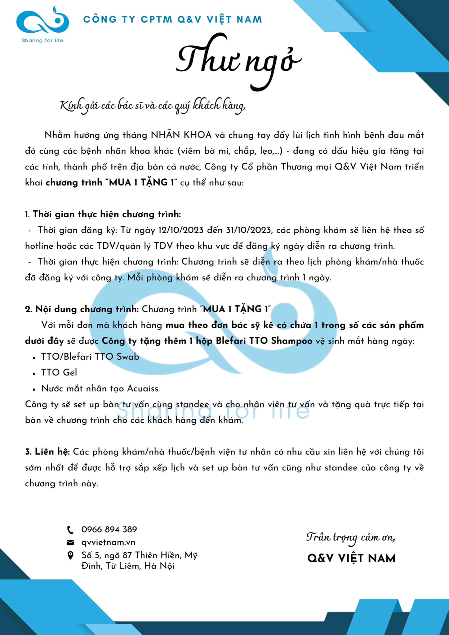 Nhằm hưởng ứng tháng #NHÃN_KHOA và đưa bộ sản phẩm #Blefari #TTO (#Tea_tree_oil) đến gần với người dân hơn, Q&V tổ chức chương trình #MUA_1_TẶNG_1 áp dụng cho tất cả các #phòng_khám_mắt, bệnh viện tư nhân trên toàn quốc (chi tiết xem tại thư ngỏ).