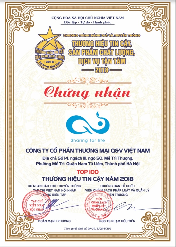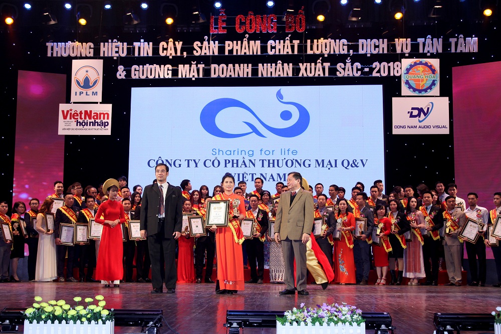 Với những giá trị bền vững và uy tín, Q&V Việt Nam cùng với doanh nghiệp khác được vinh danh giải thưởng Thương hiệu tin cậy 2018. – tổ chức tại nhà hát Âu Cơ – số 8 Huỳnh Thúc Kháng, Hà Nội trong tháng 01/2019 vừa qua. Đây được xem là giải thưởng có uy tín cao của Việt Nam – được tổ chức 1 năm một lần, bởi hội đồng Viện chính sách Pháp Luật và Quản lý, Viện Khoa học Nghiên cứu Nhân Tài Nhân lực, Hội sáng chế Việt Nam, Đơn vị tổ chức: Tạp chí Việt Nam Hội Nhập, Kênh truyền hình Quốc hội, các cơ quan báo chí Trung ương và địa phương.