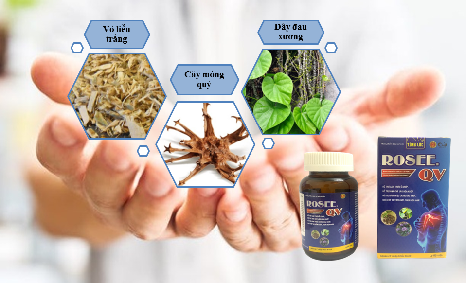 Chính vì thế, để đem lại hiệu quả tốt nên lựa chọn xương khớp ROSEE. QV có sự kết hợp móng quỷ, dây đau xương, vỏ liễu trắng, Bromelain, độc hoạt, phòng phong, Aquacal F (canxi từ tảo đỏ), acid Hyaluronic, Glucosamin sulfat, Chondrotin Sulfat, MSM được bào chế dưới dạng viên nén tiện dùng