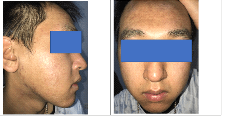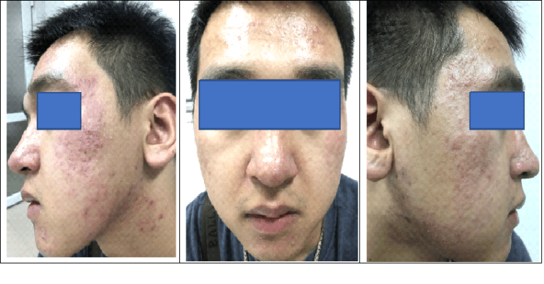 BN nam 20 tuổi, bệnh 2 năm nay, xuất hiện các sẩn ban đỏ ở 2 má, góc hàm, ngứa nhẹ được chẩn đoán trứng cá ở tuyến dưới, điều trị bằng isotretinoin 20mg/ngày trong vòng 2 tháng nhưng không đáp ứng.