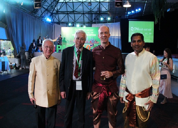 PGS TS Lê Văn Truyền - Chuyên gia cao cấp (Dược học), Nguyên Thứ Trưởng Bộ Y Tế Việt Nam (đứng thứ 2 bên trái) và Chủ Tich CPhI, Manu Leopairote (ngoài cùng bên trái)