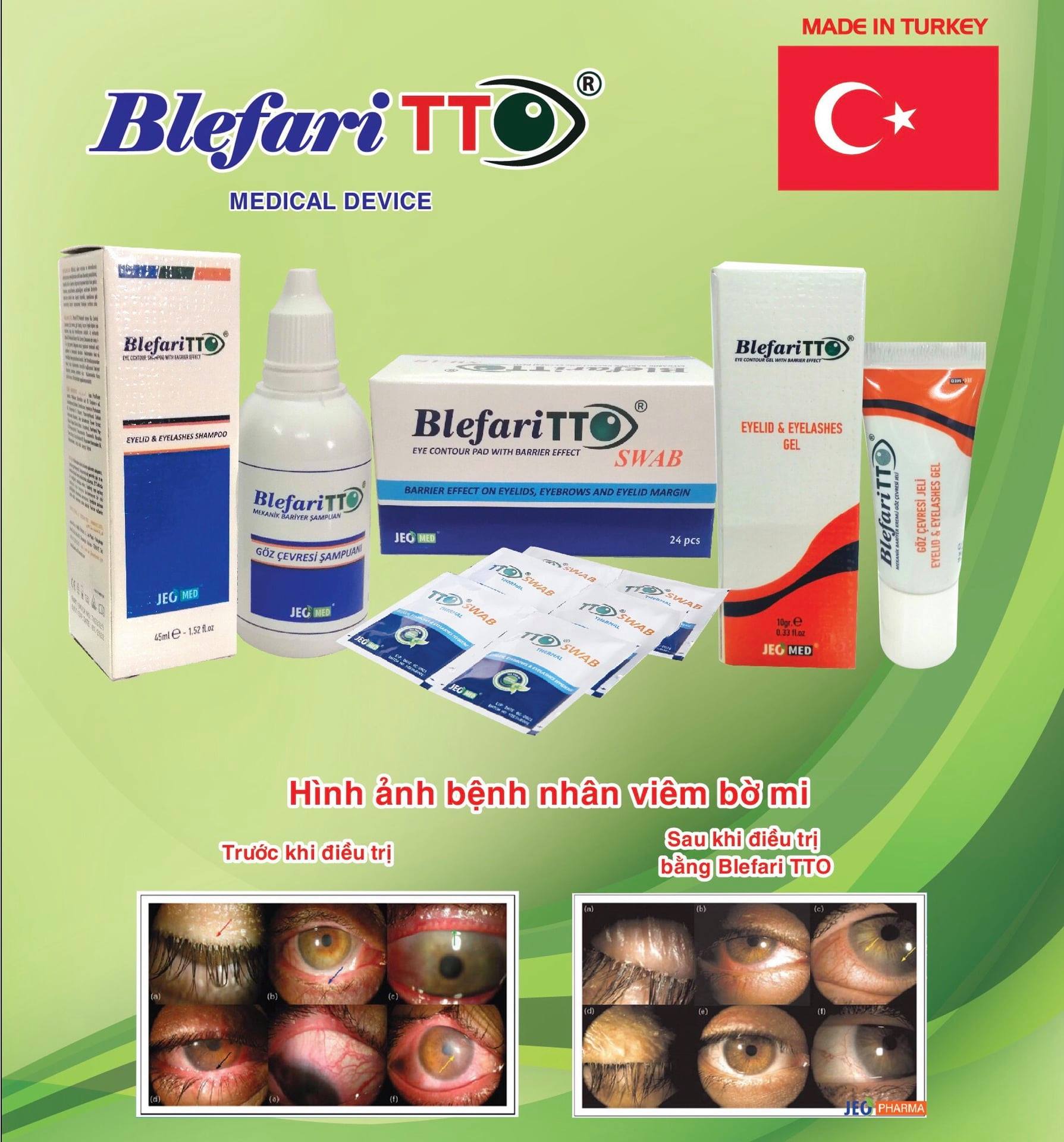 Hoạt chất Terpinen-4-ol có trong tinh dầu tràm trà là thành phần duy nhất trong tự nhiên có hoạt chất kháng khuẩn, kháng nấm và diệt ký sinh trùng Demodex. Vệ sinh mi bằng bộ 3 sản phẩm Blefari TTO Swab, Blefari TTO Shampoo, Blefari TTO gel đem lại hiệu quả điều trị tốt. Đây là sản phẩm vệ sinh bờ mi chuyên dụng duy nhất trên thị trường có tinh dầu tràm trà.