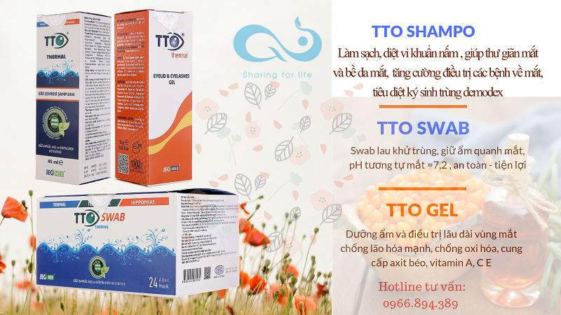 Ngoài ra bạn nên vệ sinh mắt sạch sẽ bằng sản phẩm vệ sinh và chăm sóc riêng biệt cho đôi mắt như Bộ sản phẩm Blefari TTO (TTO SHAMPO, TTO SWAB, TTO GEL), Giúp làm sạch vi khuẩn, nấm cho mắt mà còn giúp dưỡng ẩm mắt và vùng da quanh mắt được thư giãn, chống lão hóa vết chân chim,mụn quanh mắt ..nhờ có thành phần cung cấp những dưỡng chất như Vitamin A, Vitamin E, vitamin C, omega 3,6,9,7, chất chống oxi hóa, axit béo, 190 dưỡng chất từ hắc mai biển, ..