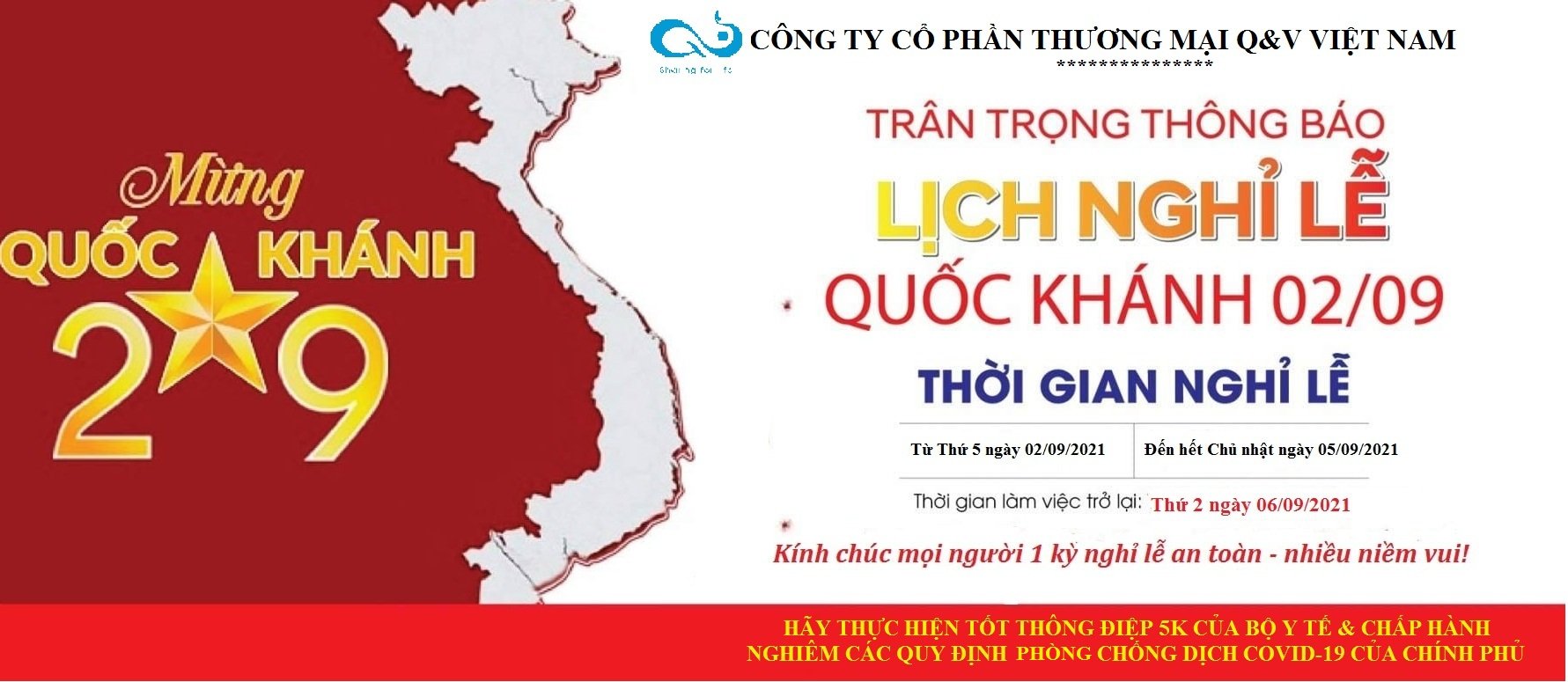 Công ty Cổ phần Thương mại Q&V Việt Nam trân trọng thông báo Lịch nghỉ Lễ Quốc khánh 2/9/2021