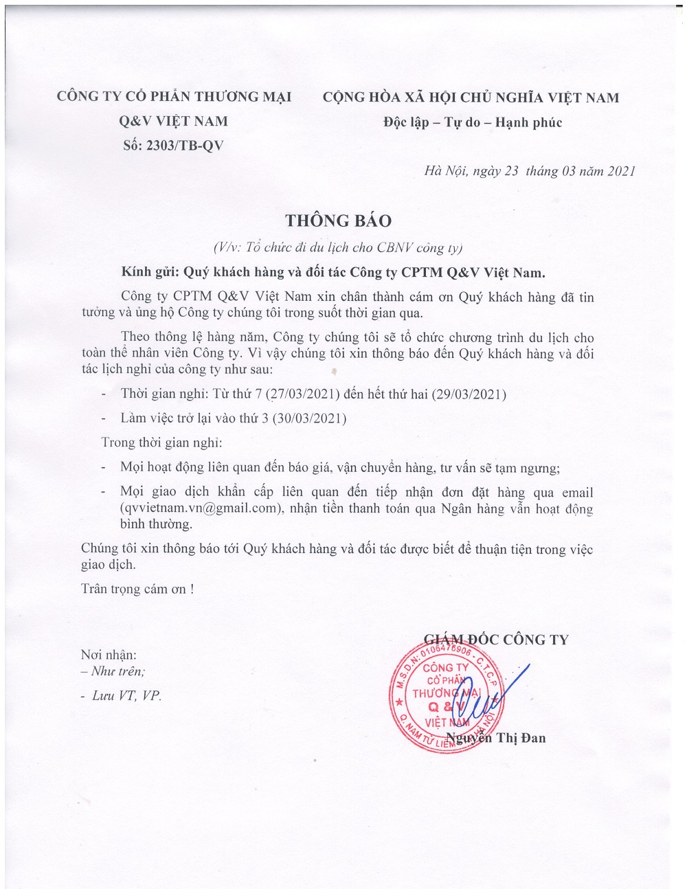 Kính gửi: Quý khách hàng và đối tác Công ty CPTM Q&V Việt Nam.